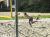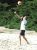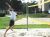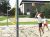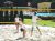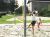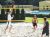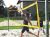 vysokou žlutě orámovanou sítí v písku plážovým volejbalem. Po